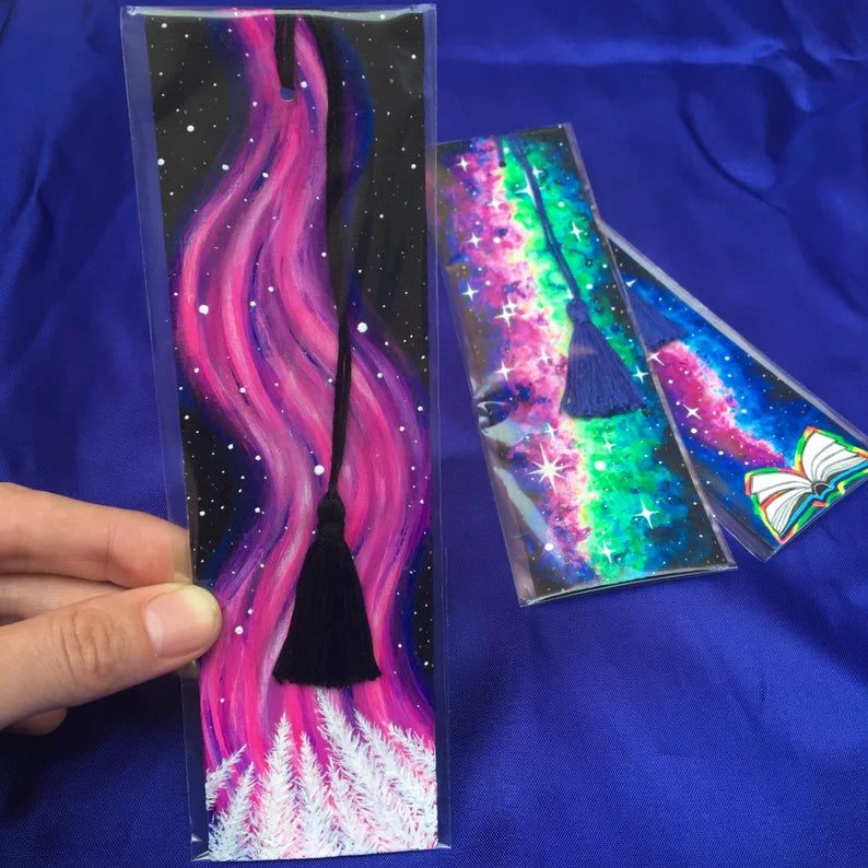 This bookmark is hand-painted in acrylic on heavyweight acrylic paper. Each bookmark is hand-cut and measures approximately 2 x 6.75 inches.
