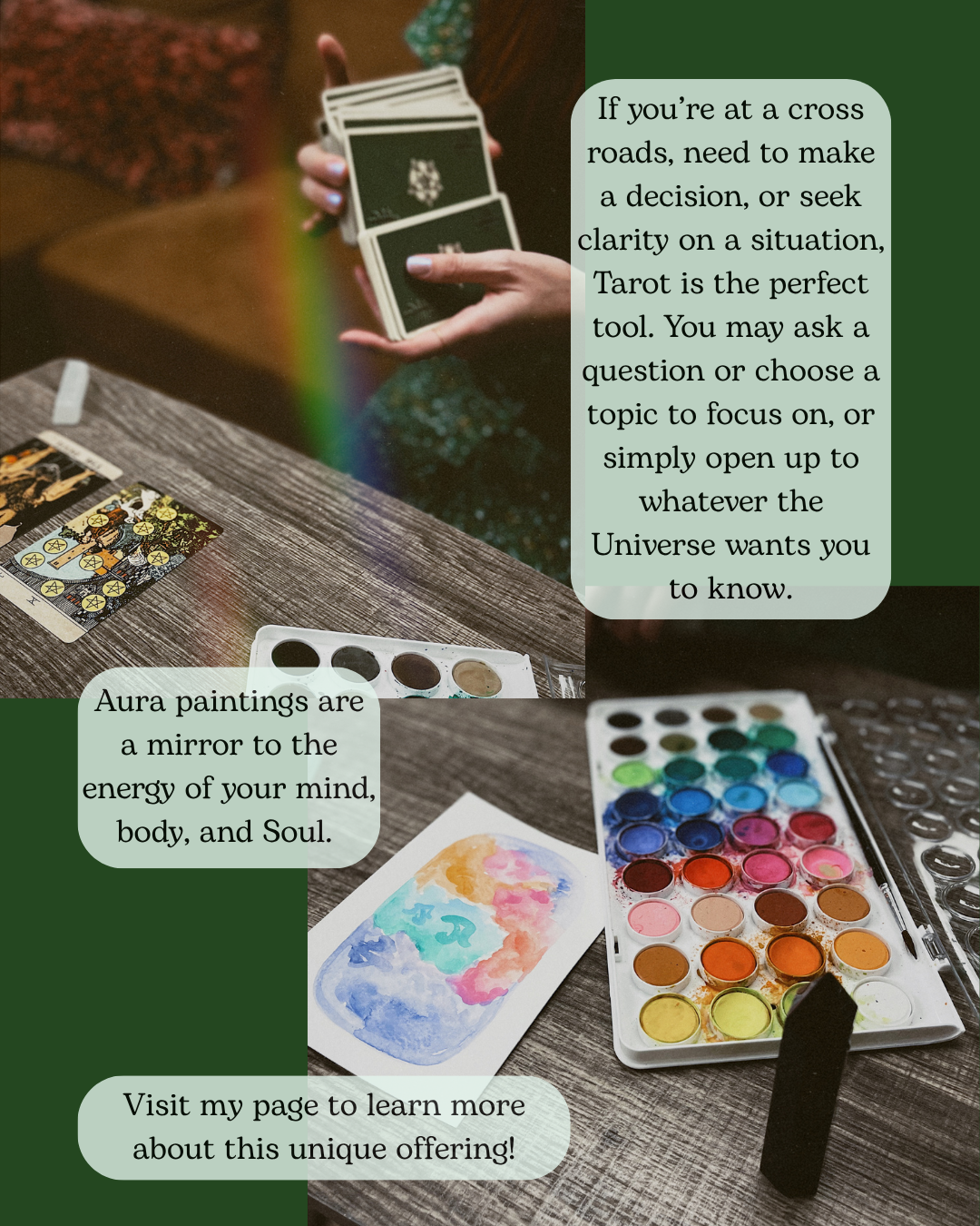 Book one on one time with Courtney for a live aura painting or tarot reading! Make sure that your calendar date aligns with your chosen event.